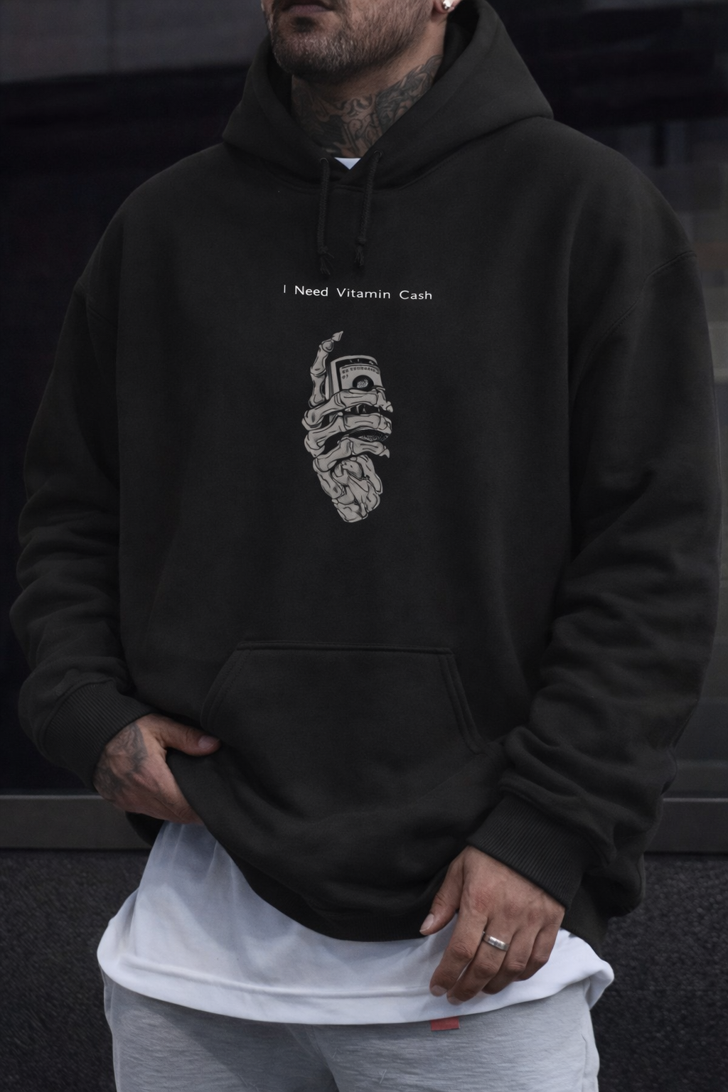 For the chronically underpaid and permanently ambitious. The Vitamin Ca$h Hoodie features a minimalist front print with a skeletal hand gripping a stack of notes beneath the understated line, “I Need Vitamin Ca$h.” Dark, sharp, and unapologetically honest.