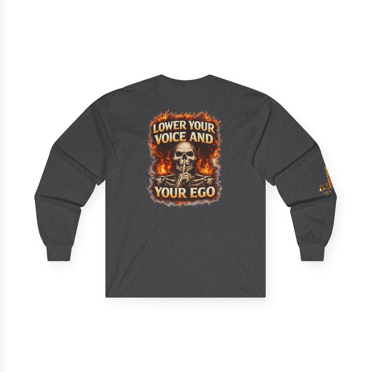 This long sleeve tee is a public service announcement wrapped in fire. Featuring a bold skull graphic surrounded by flames and the unmistakable message “Lower Your Voice and Your Ego”, it’s made for people who don’t need to shout to be heard.