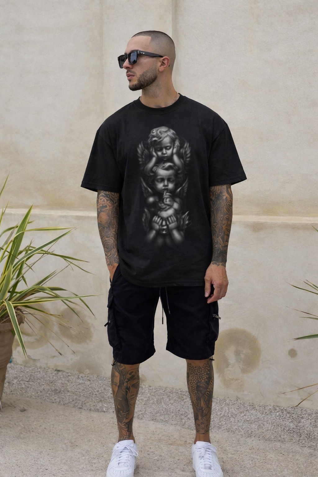The Silence Between Saints tee captures a haunting black-and-white portrait of two angelic figures wrapped in quiet intensity. It’s not loud. It doesn’t need to be. The shading, the contrast, the closeness — it pulls you in without asking permission.