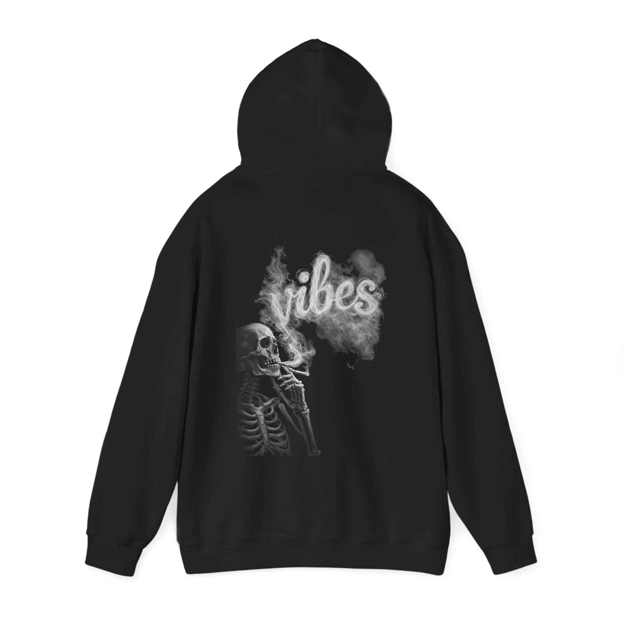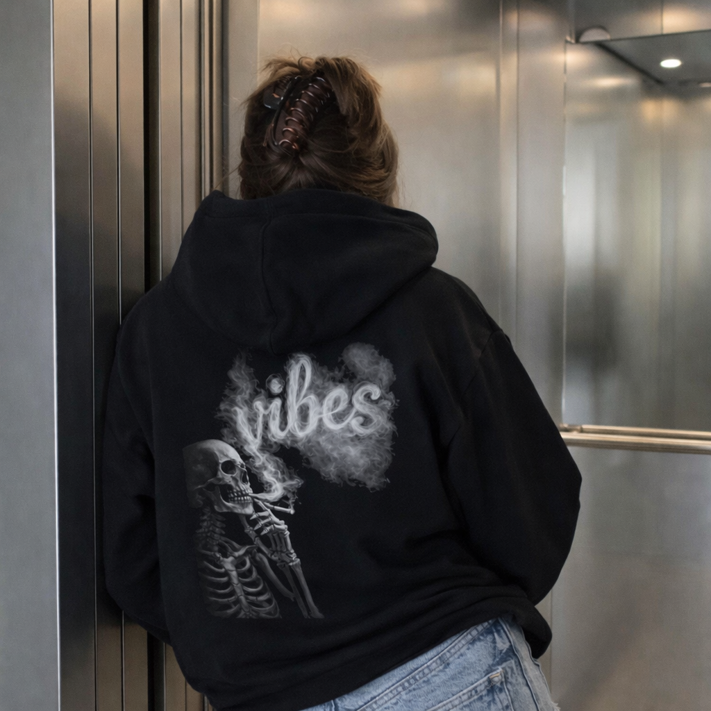 This heavyweight hooded sweatshirt brings a moody, streetwise edge to chilly days. Soft yet sturdy, it carries a striking monochrome back graphic: a contemplative skeleton exhaling smoky lettering that reads “vibes.” Wear it when you want to curl into quiet energy — late-night walks, skate sessions under streetlamps, or coffee shop study marathons. The roomy kangaroo pocket and double-lined hood feel familiar and protective. Subtle DTF sleeve/wrist print and optional chest embroidery let you add small, tactile details that match the design’s gritty aesthetic. This is for people who prefer atmosphere over noise — calm, dark, and unmistakably expressive.